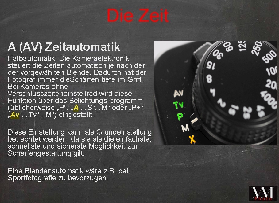 Dazu die richtige Kameraeinstellung: ich rate zur Zeitautomatik „A“ (AV). Sie wählen die Blende vor und die Kamera stellt dazu die passende Zeit ein. Somit können Sie immer selbst die Schärfentiefe (wie oben beschrieben) bestimmen.